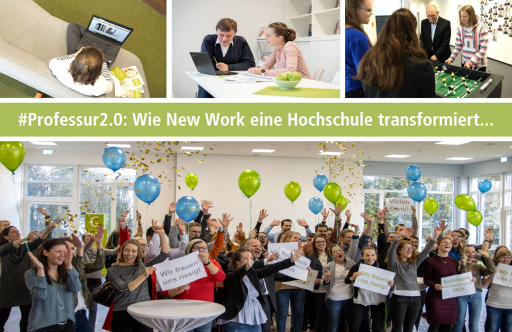 Mit der #Professur2.0 wurde eine moderne Form der Arbeit entwickelt. Statt festen Lehr-Wochenstunden stellen sich Professor*innen aus einem modularen Deputat der wissenschaftlichen Kernfelder (schreiben, lehren, prüfen, repräsentieren, forschen) ihre individuelle Professur selbst zusammen. Neben der eigenverantwortlichen Arbeitsgestaltung bestimmen sie auch Ort und Zeit – und können dank digitaler Infrastruktur ihre Vorlesungen von zuhause als auch an einem der 21 Studienzentren halten. Neben virtuellen Projektteams, die selbstorganisiert in Sprints arbeiten, findet der strategische Dialog mit dem Kollegium und Partnern in OpenSpaces statt. Die #Professur2.0 zeigt eindrücklich, dass Eigenverantwortung und Kollaboration in einer lernenden Organisation kein Widerspruch, sondern Symbiose ist.