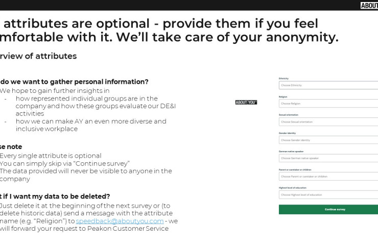 Trotzdem reichen uns diese Zahlen allein nicht aus. Daher haben wir in 2020 darüber hinaus den Diversity Circle ins Leben gerufen, um uns noch stärker darauf zu fokussieren, ob unsere Ansprüche auch bei unseren Mitarbeitenden ankommen und gelebt werden. Aus diesem Circle, in dem sich Mitarbeitende neben ihrem regulären Job für Themen rund um die Förderung von Diversity bei ABOUT YOU einsetzen, ist auch das Projekt der Diversity Attributes entstanden.