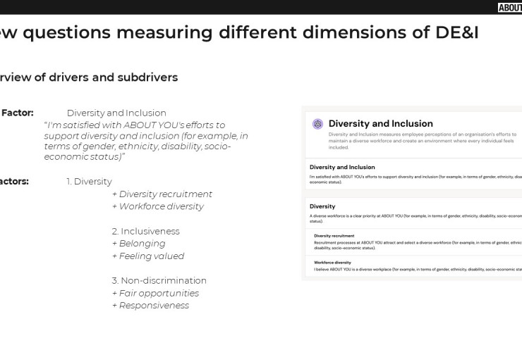 Im Rahmen dieses Circles fiel uns dann eine Diskrepanz auf: In dem monatlichen Survey an alle Mitarbeitenden fragen wir sämtliche klassischen Formen des Employee Engagements ab, u.a. auch die Zufriedenheit mit der Förderung von Diversity und der Gleichbehandlung aller Mitarbeitenden auf unterschiedlichsten Dimensionen. Allerdings bewerten hier alle Mitarbeitenden die gleichen Fragen, d.h. auch, dass z.B. ich als weiße Frau in einer Führungsposition mit Deutsch als Muttersprache bewerte, ob ABOUT YOU ein inklusives Arbeitsumfeld bietet, auch z.B. für Mitarbeitende die keine deutschen Muttersprachler sind. Wenn ich also diese Frage mit Ja oder Nein beantworte, spreche ich nicht als Teil der Betroffenen und kann somit keine valide Einschätzung für Mitarbeitende geben, die z.B. keine deutschen Muttersprachler sind.