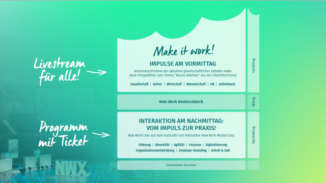 Morgens setzen wir Impulse, am Nachmittag sprechen wir über Deine Perspektiven. Und jede*r kann die Impulse vom Vormittag für sich mitnehmen! Du triffst prominente NEW WORKer live in der Deiner Masterclass und hast die Chance, Dich mit anderen zum Thema Neues Arbeiten auszutauschen. Mehrwert garantiert.