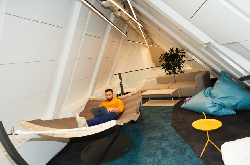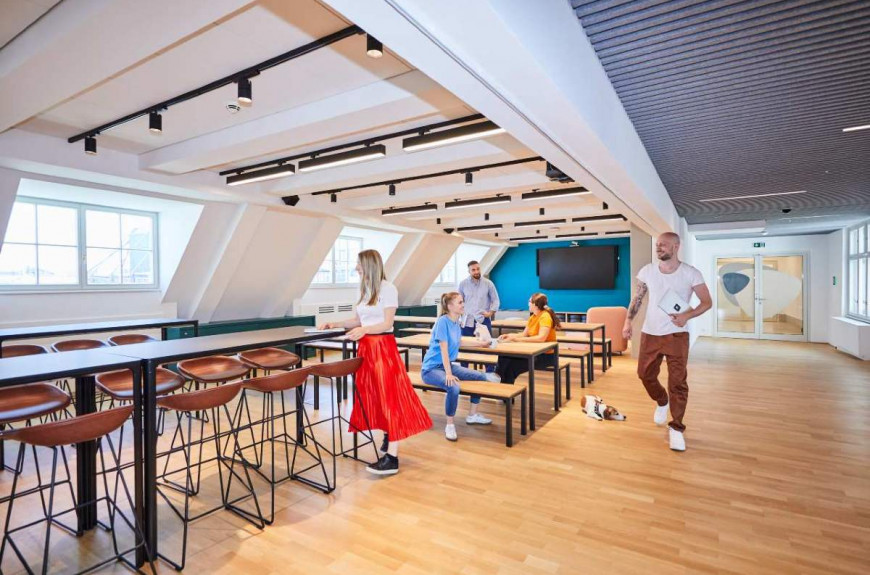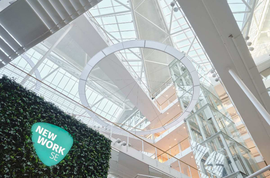 Auf zwei Geschossen stehen den rund 300 Mitarbeiterinnen und Mitarbeitern 5.500 Quadratmeter zur Verfügung, zusätzlich gibt es drei Galerien sowie zwei Dachterrassen (s. Fotos unten). Die Arbeitsplätze sind auf verschiedene Räume und Zonen verteilt, die Mitarbeiterinnen und Mitarbeiter können täglich wählen, wo sie sich niederlassen und das Kollaborieren, Lernen, Kommunizieren und konzentrierte Arbeiten am besten gelingt. "Hybrid ist das neue Normal", so Sandra Bascha von NEW WORK SE, "wahrscheinlich wird NEW WORK nirgendwo in Österreich authentischer gelebt wird, als in unserer NEW WORK Base". (Mehr Informationen zur neuen Wiener NEW WORK Base gibt es hier)