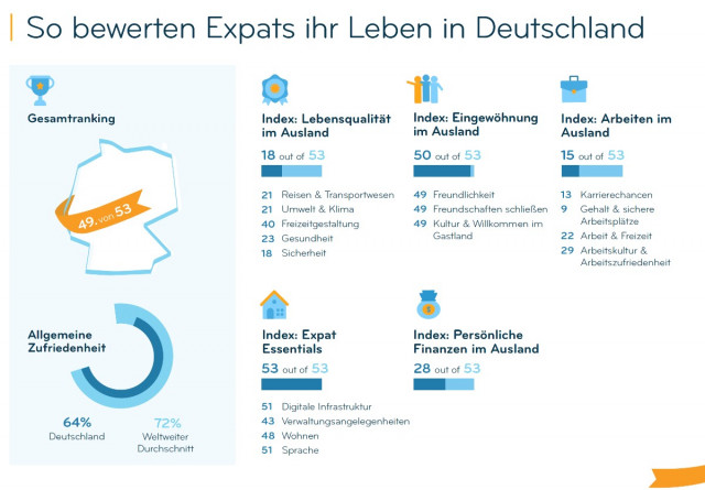 Die Expat Insider Studie ist eine der größten Umfragen zum Thema Leben und Arbeiten im Ausland und bietet detaillierte Informationen zur Zufriedenheit mit der Lebensqualität, der Eingewöhnung, dem Arbeiten im Ausland, den persönlichen Finanzen sowie den sogenannte Expat Essentials*. Die für die Studie befragten Expats stehen in Deutschland offensichtlich vor einer ganzer Reihe grundsätzlicher Problemen: Mangelnde Digitalisierung, starre Bürokratie und ein angespannter Wohnungsmarkt sind nur einige der Schwierigkeiten, mit denen sie sich in Deutschland zu kämpfen haben. Zudem gilt die deutsche Bevölkerung als eine der unfreundlichsten weltweit, was dazu führt, dass Expats nur schwer Freunde finden und sich gesellschaftlich integrieren können.