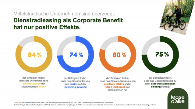 Dabei sind sich die befragten Unternehmen einig – Dienstradleasing als Corporate Benefit zahlt sich positiv aus: 84 Prozent der Studienteilnehmenden sind überzeugt, dass Dienstradleasing die Gesundheit ihrer Mitarbeitenden fördert und ihr Wohlbefinden am Arbeitsplatz verbessert. Darüber hinaus sehen 75 Prozent der Befragten in Dienstradleasing-Angeboten einen Weg zur stärkeren Bindung der Mitarbeitenden an das Unternehmen und damit einhergehend eine längere Betriebszugehörigkeit. Drei Viertel der mittelständischen Unternehmen sind zudem der Meinung, dass der Mitarbeiterbenefit den Recruitingprozess positiv beeinflusst. Ein attraktives Corporate-Benefits-Programm einschließlich Dienstradleasing kann potenzielle Bewerberinnen und Bewerber, insbesondere aus der Gen-Z, anlocken.