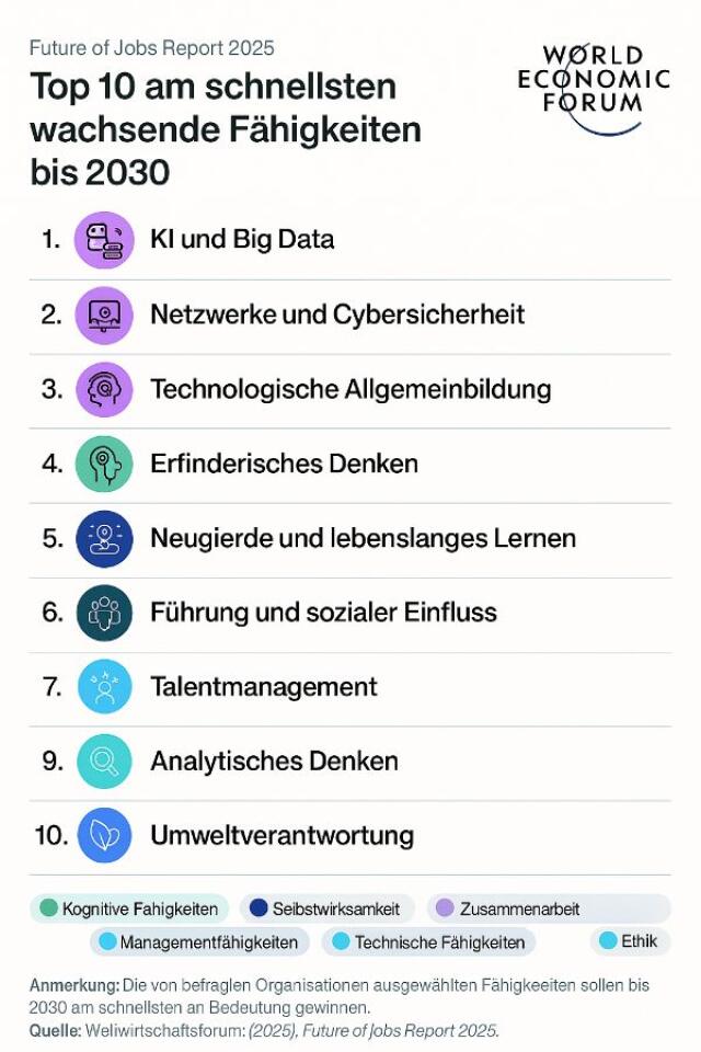 Künstliche Intelligenz, technologische Allgemeinbildung, analytisches Denken: Was vor kurzem noch oft nach Spezialwissen klang, gehört schon bald zum Standardrepertoire gefragter Fachkräfte. Laut „Future of Jobs Report 2025“ des Weltwirtschaftsforums verändern sich die Anforderungen an Arbeitnehmerinnen und Arbeitnehmer rasant. Dabei zählen nicht nur digitale Kompetenzen, sondern auch Soft Skills wie Kreativität, Resilienz oder Umweltverantwortung zu den größten Wachstumsfeldern. Die Infografik zeigt die Top 10 Fähigkeiten, auf die Unternehmen bis 2030 besonders setzen.