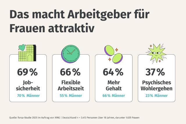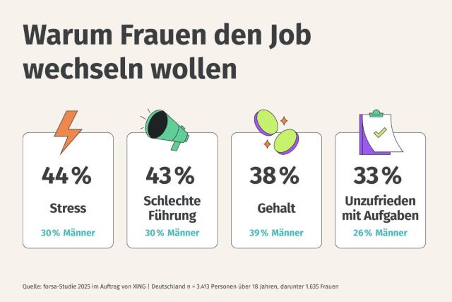 Die von forsa durchgeführte Umfrage zeigt, dass jede fünfte Frau (20 Prozent) mit ihrer beruflichen Situation unzufrieden ist, während dies nur auf 12 Prozent der Männer zutrifft. Besonders alarmierend ist, dass Stress (44 Prozent), schlechte Führung (43 Prozent) und nicht zufriedenstellende Arbeitsaufgaben (33 Prozent) als Hauptgründe für einen Wechsel genannt werden – noch vor einer zu niedrigen Bezahlung. „Frauen sind weiterhin überdurchschnittlich oft in Teilzeit beschäftigt, und sie tragen die Hauptlast der Care-Arbeit in der Familie“, erklärt Petra von Strombeck, CEO der XING-Muttergesellschaft New Work SE. „Es ist kein Wunder, dass enge Zeitfenster für Arbeit und Kinderbetreuung zu einem hohen Stresslevel führen – zumal dann, wenn man das Gefühl hat, nicht genügend Unterstützung von der Führungskraft zu bekommen oder beruflich auf einem Abstellgleis gelandet zu sein.“