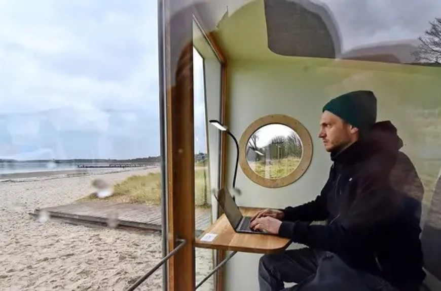 Aus dieser Kabine, die in seinem Garten steht, hat Plambeck dann mit seinem Freund Sebastian Lier das Projekt "Nordort" entwickelt. Um die Schönheit der Ostsee auch bei dem im Norden nicht immer gemütlichen Wetter zu genießen, "fanden wir die Idee großartig, einen Ort zu schaffen, in dem man ganz nah an der Natur dran sein kann, aber trotzdem nicht nass wird oder frieren muss", erklärt Lier. Zuerst habe man eigentlich nur daran gedacht, einen Platz zum stillen Genießen und Entspannen zu schaffen. Der Gedanke, daraus einen wetterfesten Outdoor-Arbeitsplatz zu machen, sei dann später gekommen. Bald kann das Beach-Office, das in der Version in Eckernförde mit Beleuchtung, Heizung und Wlan-Anschluss ausgestattet ist, stunden- oder tageweise gemietet werden. Oder gleich zu Preisen ab 18000 Euro, je nach Ausstattung, gekauft werden.