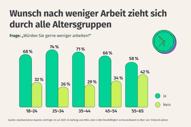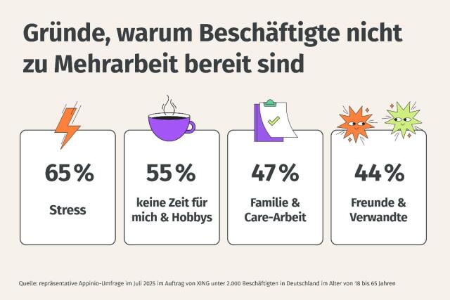 Stress, fehlende Zeit für sich selbst, Care-Arbeit und soziale Kontakte zählen zu den häufigsten Gründen, warum Beschäftigte in Deutschland Mehrarbeit ablehnen oder ihre Arbeitszeit reduzieren wollen. 65 Prozent der Befragten nennen Überlastung als Hauptgrund gegen zusätzliche Stunden im Job, 55 Prozent wünschen sich mehr Raum für persönliche Aktivitäten, 47 Prozent geben an, mehr Zeit für familiäre Sorgearbeit zu benötigen. Das geht aus dem neuen XING Arbeitsmarktreport 2025* hervor, für den das Marktforschungsinstitut Appinio im Auftrag des Job-Netzwerks 2.000 Beschäftigte in Deutschland befragt hat.